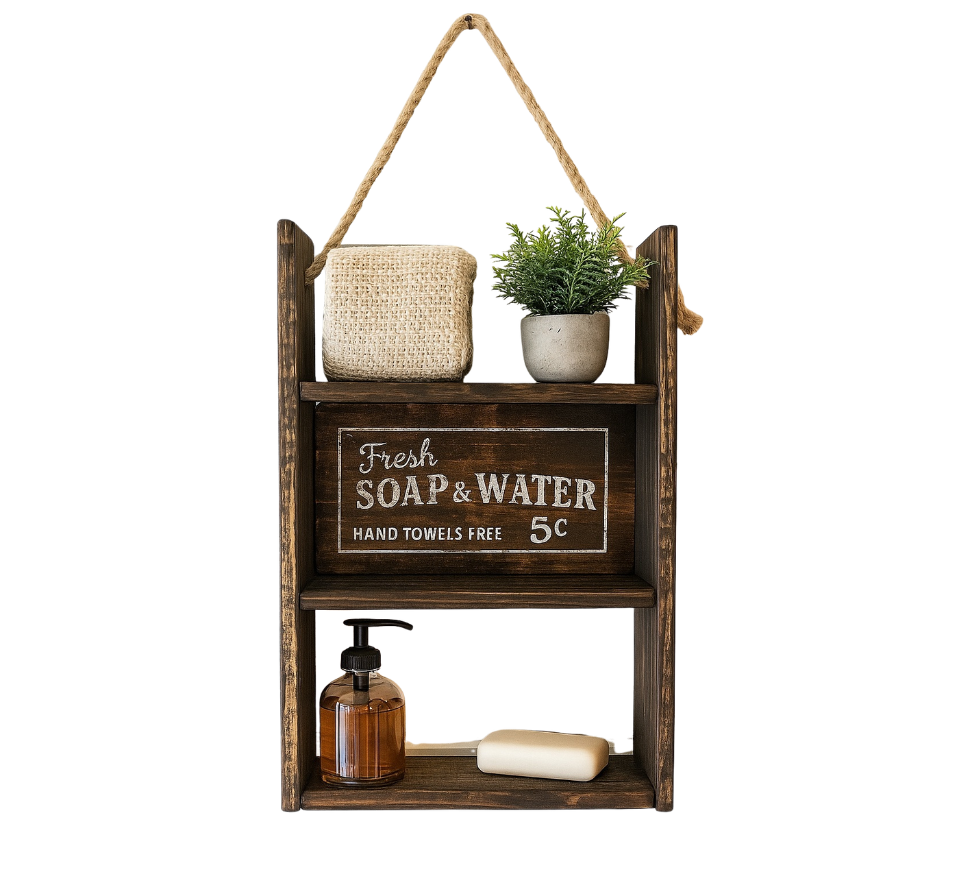 Bring a touch of vintage charm and farmhouse warmth to your bathroom or laundry room with this handcrafted “Fresh Soap & Water” hanging shelf. Each piece is built from solid wood, stained by hand, and finished for a timeless rustic look.